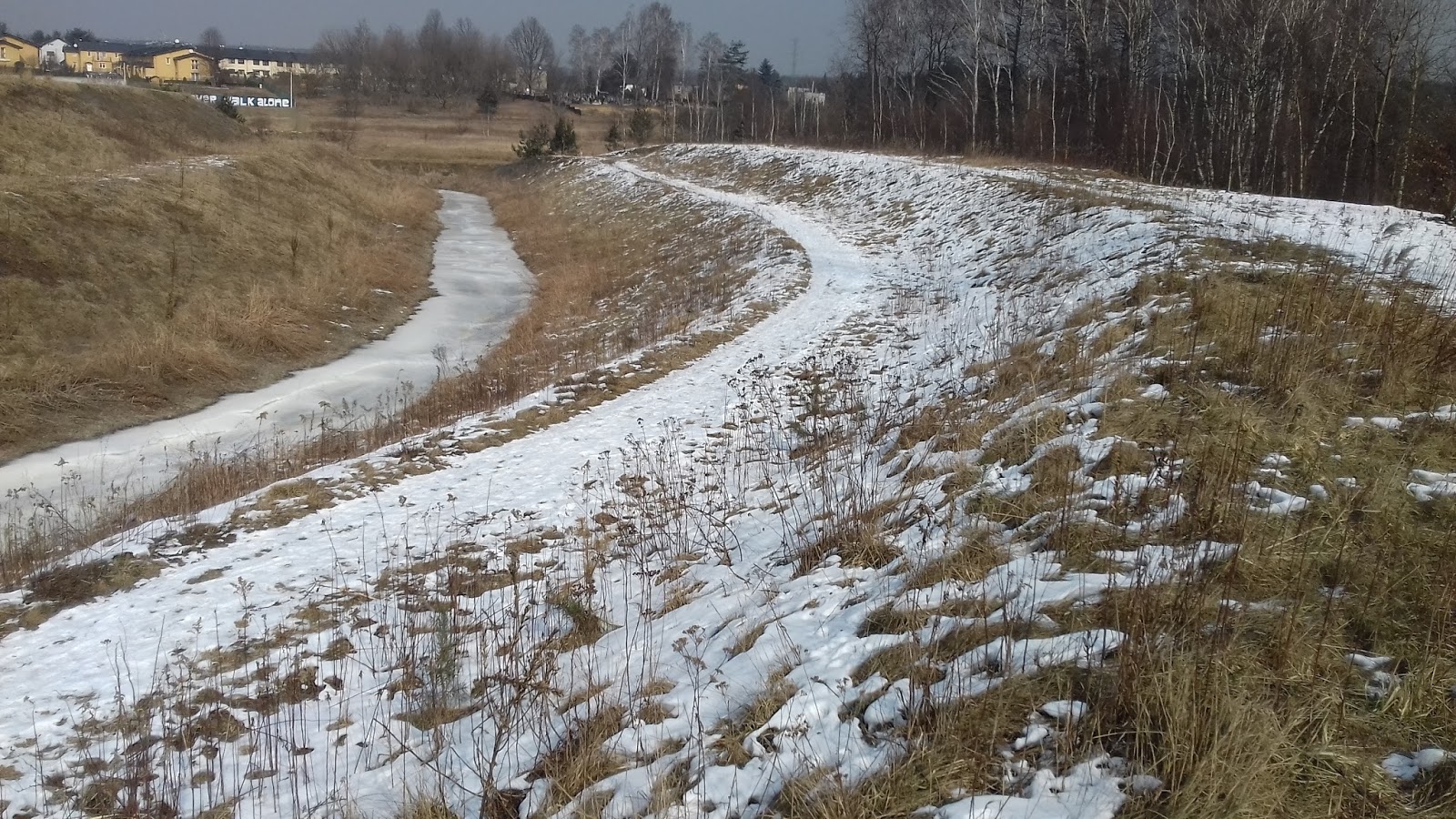 Później przez Pszczyńską i krótko DK 94 jechałem w kierunku Siemianowic Śląskich, ale znalałem skrót i nim dojechałem do ul. Brzezińskiej, a następnie wzdłuż Al. Jana Pawła II dojechałem do Piekar. Obok „urazówki” w Piekarach skręciłem w ul. 1 Maja i dojechałem do „rzeki” Szarlejki – w Wikipedii pisze, ze to jest struga, niech będzie. Wałem wzdłuż Szarlejki dojechałem do ul. Karola Miarki. Dalej prowadził mnie czerwony i niebieski szlak pieszy dzięki którym dojechałem prosto do Kopca Wyzwolenia, czyli celu mojej wycieczki.