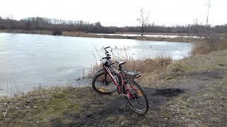 Po wjechaniu na szczyt, po krótkiej przerwie i zrobieniu paru fotek, zjechałem na dół i początkowo ścieżką rowerową, a później ul. Jana Pawła II dojechałem do rzeki Brynicy, stanowiącej granicę Piekar z Dobieszowicami oraz Górnego Śląska i Małopolski. Niedaleko mostu na Brynicy stoi Dworek Donnersmarck, w którym mieści się restauracja. Wcześniej był to pałacyk myśliwski należący do rodziny Henckel von Donnersmarck. Budynek z zewnątrz wygląda na starannie odnowiony za co trzeba pochwalić jego obecnych właścicieli. W sumie przejeżdżając obok zaciekawiło mnie czy rodzina Donnersmarck wie, że ich nazwisko jest wykorzystywane do działalności restauracyjnej.Po przejechaniu rzeki po kilkuset metrach po prawej stronie znajduje się polski schron bojowy, a następnie po kolejnych kilkuset metrach przejeżdża się nad autostradą A1. W planach miałem dojechanie do Bobrownik asfaltem, ale jak napisałem na początku, człowieka kusi. No i mnie skusiło. Zaraz za autostradą skręciłem w prawo w drogę techniczną, która początkowo była asfaltowa i prowadziła ostro w dół, ale niestety asfalt się szybko skończył a mnie się nie chciało już wracać z powrotem pod górę więc zdecydowałem się na jazdę drogą gruntową przez pola. Nie było to najszczęśliwsze rozwiązanie, gdyż droga była miękka i częściowo rozjeżdżona przez sprzęt rolniczy. Próbowałem jechać bokiem ścieżki ale i tak skończyło się obklejeniem błotem całego roweru. Jakoś jednak dojechałem do Bobrownik i stamtąd przez dzielnice Piekar Śląskich: Brzozowice, Kamień i Brzeziny Śląskie dojechałem do Żabich Dołów stawów leżących pomiędzy Chorzowem a Bytomiem. Miejsce o tej porze roku okazało się ciche i puste, spotkałem tylko pojedynczych ludzi.